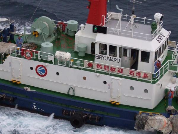 而且還來個大甩尾!仔細一看,才知道是日本方面的引導船