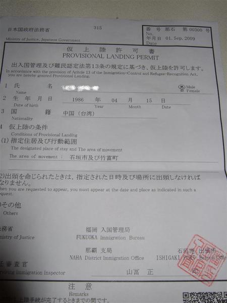 排隊的獎勵是一張「登陸許可」...同樣的,上頭有很「刺眼」的「國籍」...